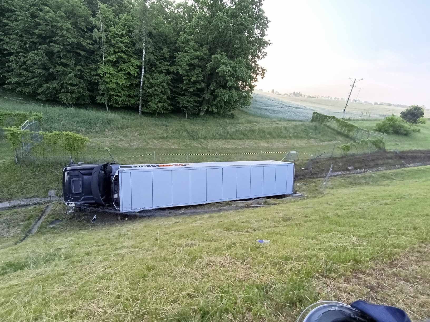 Ciężarówka wypadła z autostrady A1 i stoczyła się do rowu