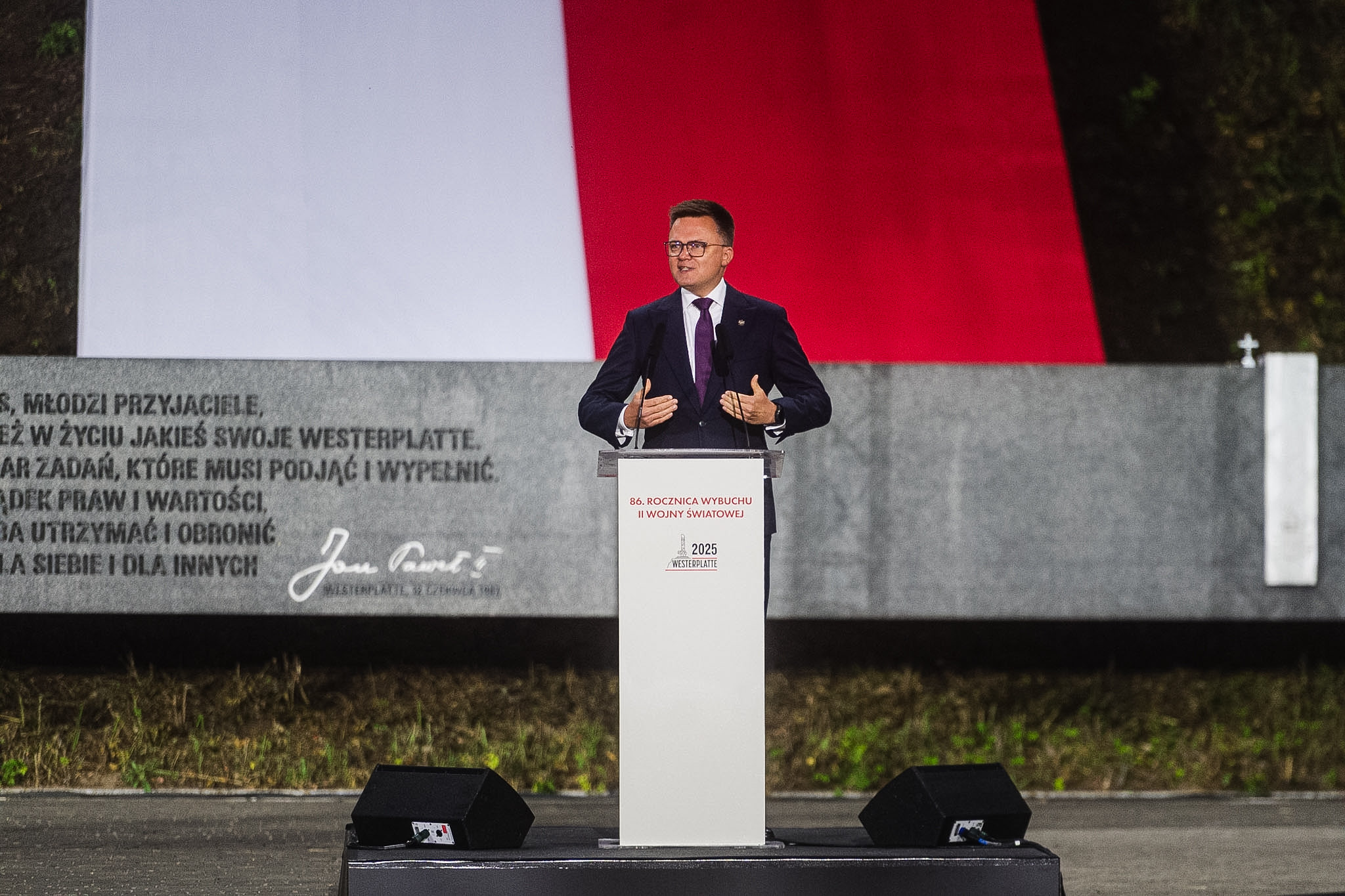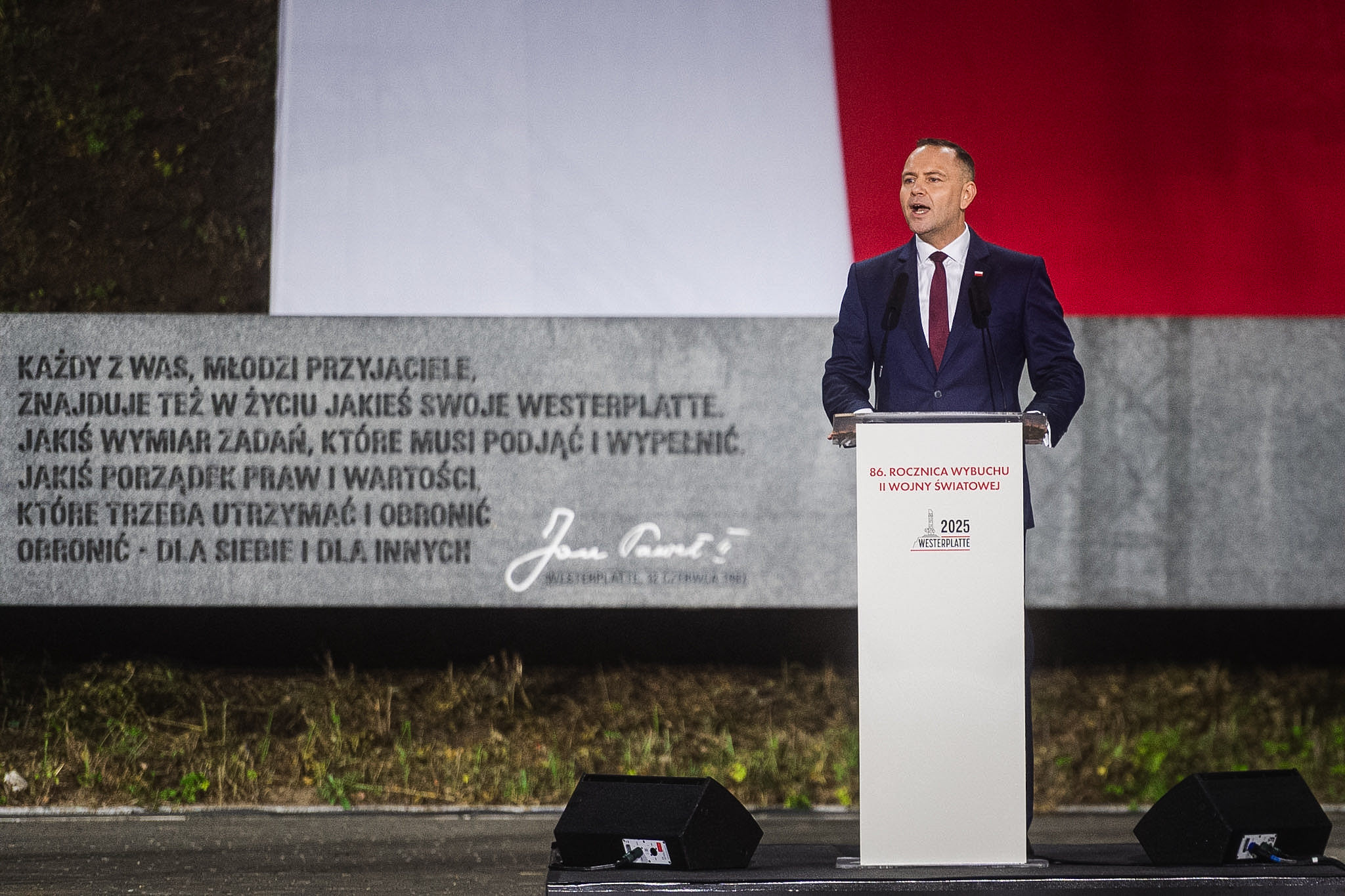 Następnie przyszedł czas na przemówienia. Jako pierwszy głos zabrał Karol Nawrocki, który rozpoczął od tego, że należy „załatwić kwestię reparacji od Niemiec”.