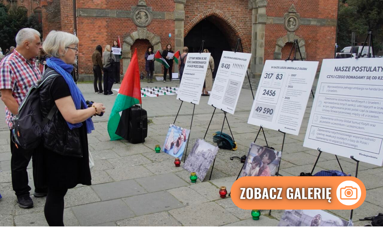 - Izrael dokonuje ludobójstwa w Strefie Gazy, mordując i głodząc cywili . Według najnowszego raportu IPC - organu ONZ - do końca września 600 tys. osób będzie na skraju śmierci głodowej. Nie wiemy, ile osób zostało zamordowanych przez Izrael, odkąd dwa lata temu rozpoczął eskalację działań ludobójczych. Znamy z imienia i nazwiska 60 tys. zabitych, w tym 19 tys. dzieci – informuje Fundacja Widzialne, która inspirując się podobnym wydarzeniem w Warszawie, organizowanym przez inicjatywę „Solidarnie z Palestyną” zorganizowała wydarzenie pod Bramą Wyżynną w Gdańsku.