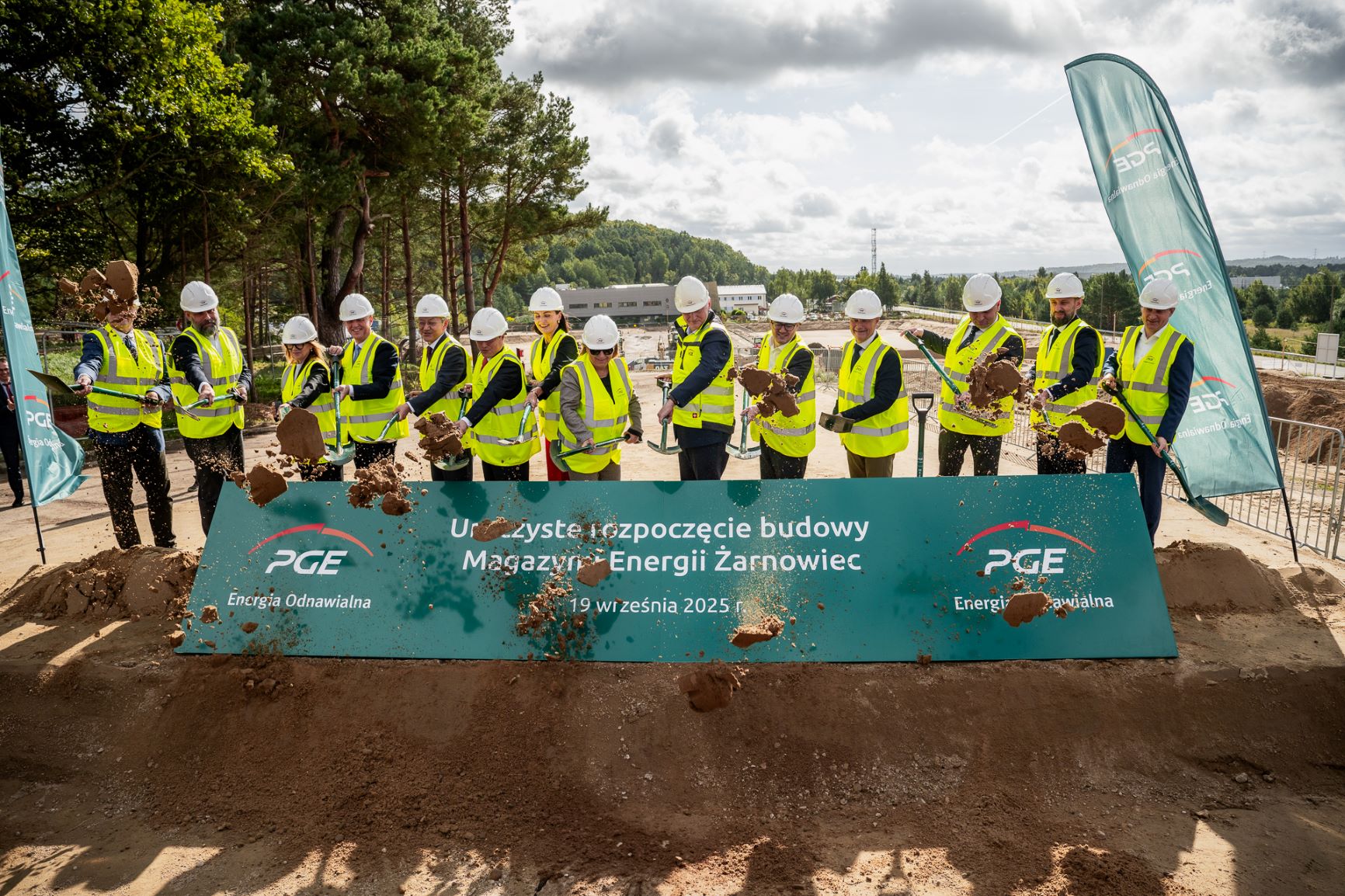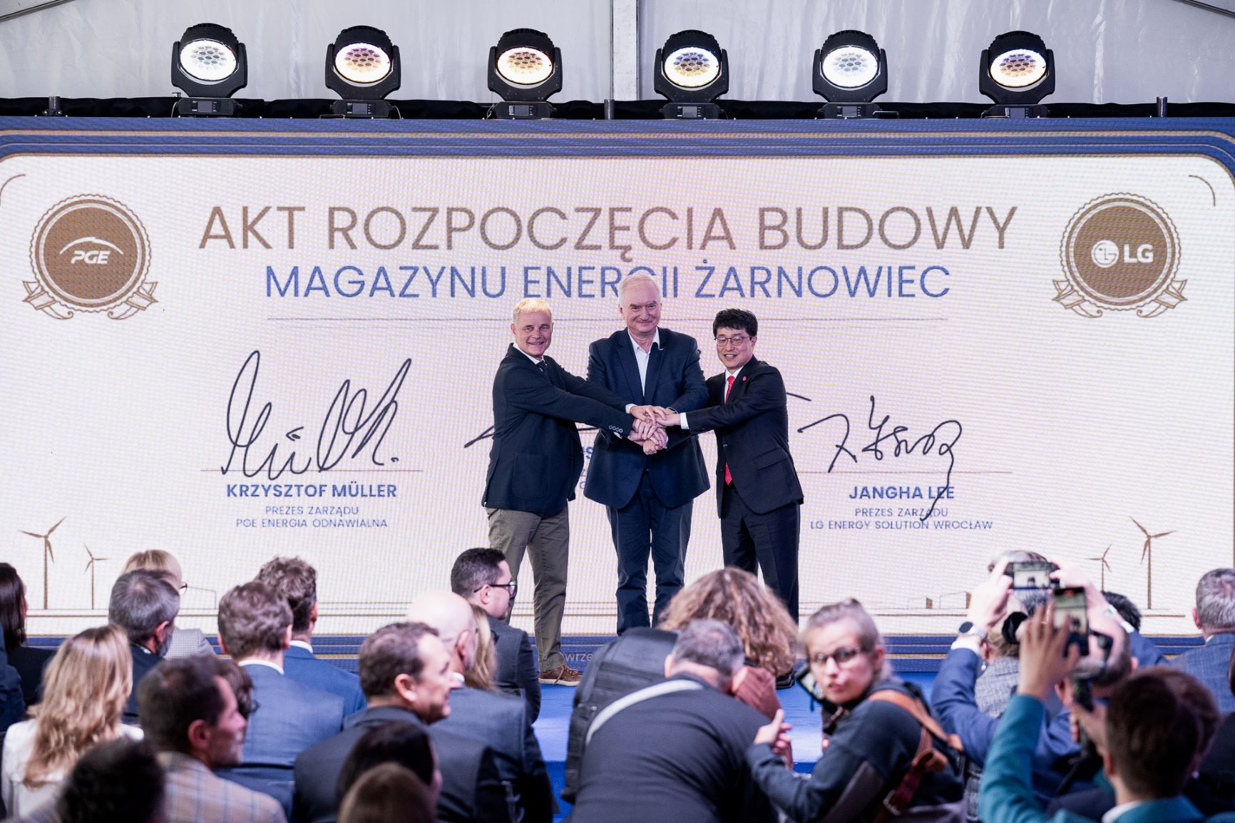 Magazyn na na zlecenie Grupy PGE wybuduje firma LG Energy Solution Wrocław. Przedstawiciele obu spółek podpisali akt rozpoczęcia budowy, a po konferencji wbito pierwszą łopatę na budowie w Żarnowcu.