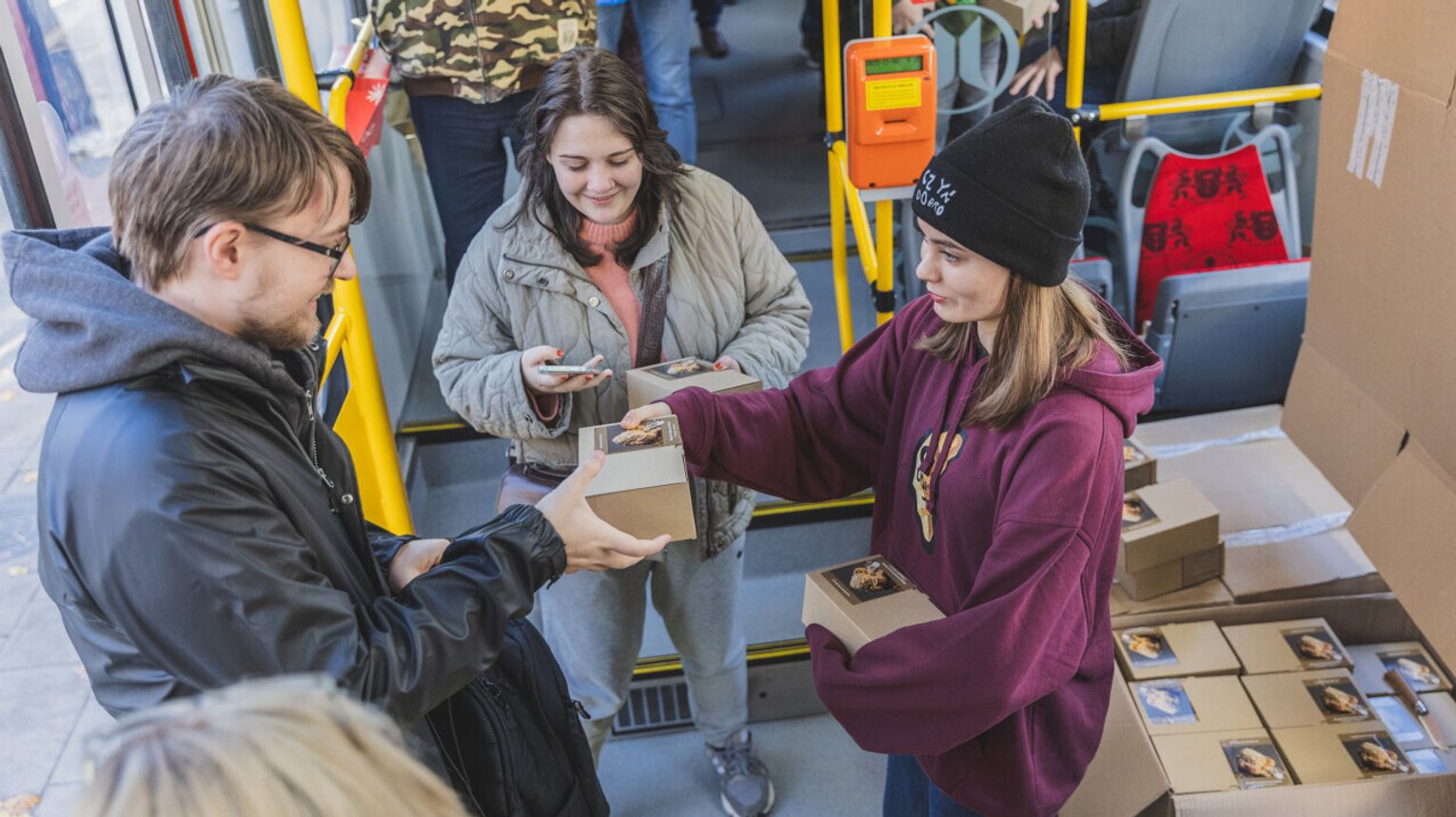 Na pasażerów czekały nie tylko rogale, ale też pocztówka z zaproszeniem na jedno z największych wydarzeń w Poznaniu - imieniny ulicy Świętego Marcina. Święto jednej z głównych ulic Poznania przypada 11 listopada” i jest obchodzone od 1994 r.