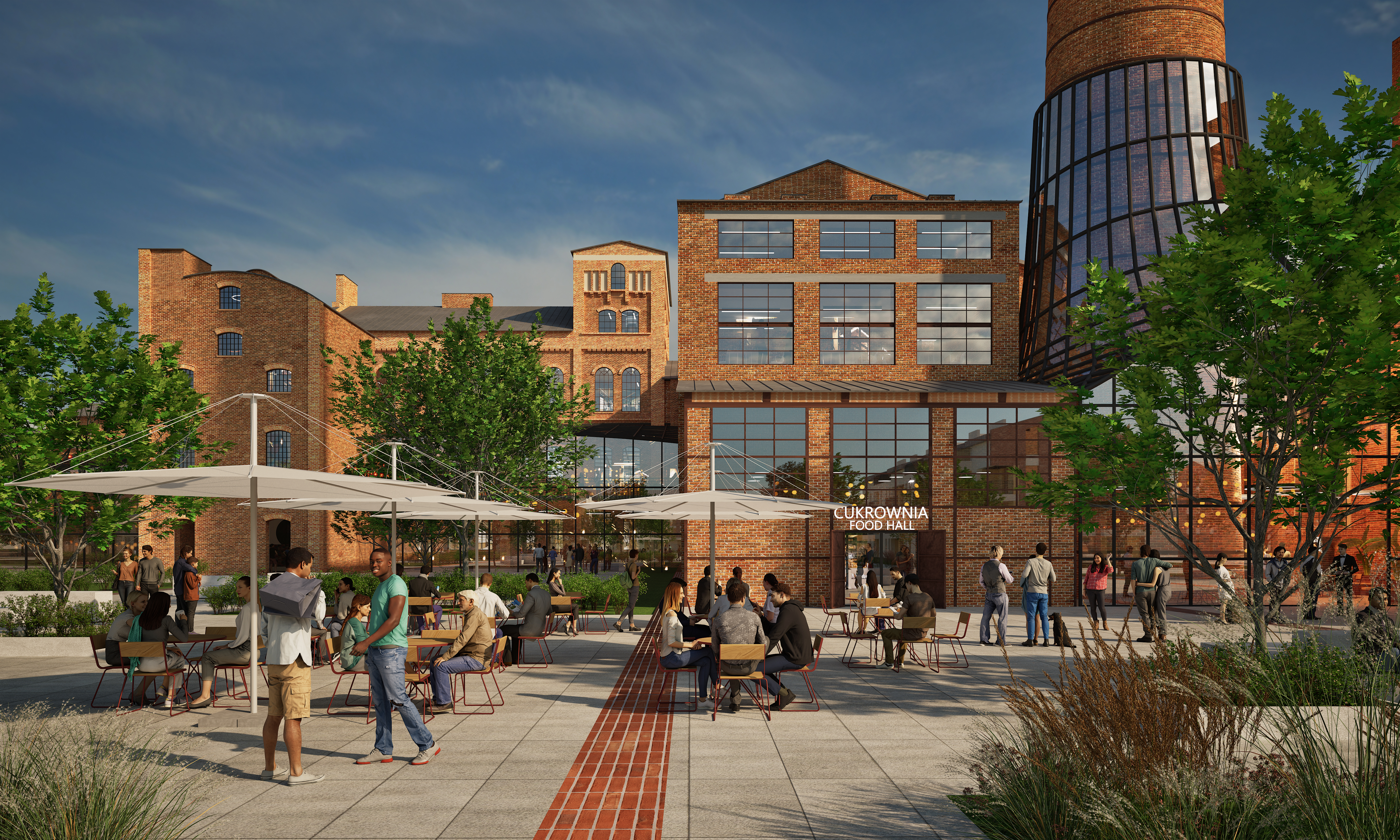 Równolegle z budową części mieszkaniowej, prowadzone będą prace nad adaptacją 29 zabytkowych budynków dawnego kompleksu fabrycznego. Inwestor planuje przekształcić je w centrum usługowo-kulturalno-rekreacyjne z restauracjami, kawiarniami, sklepami i przestrzeniami biurowymi. Centralnym punktem nowej dzielnicy stanie się plac miejski, miejsce spotkań i lokalnych wydarzeń. Zachowany zostanie również charakterystyczny ceglany komin będący symbolem przemysłowego dziedzictwa tego miejsca.