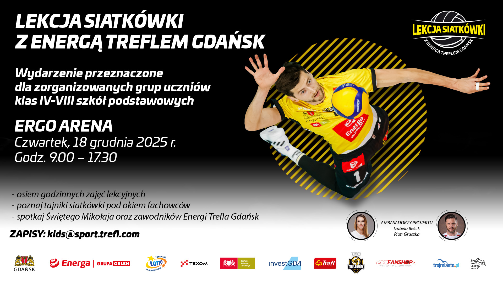 – Jeśli ciekawi Was siatkówka lub po prostu lubicie sportową zabawę – to nasza lekcja jest czymś właśnie dla Was! Nie przegapcie tej wyjątkowej okazji, by spróbować sił na prawdziwym siatkarskim boisku i poczuć się jak zawodowcy. Czekamy na Was 18 grudnia w Ergo Arenie – mówi Mariusz Wlazły.