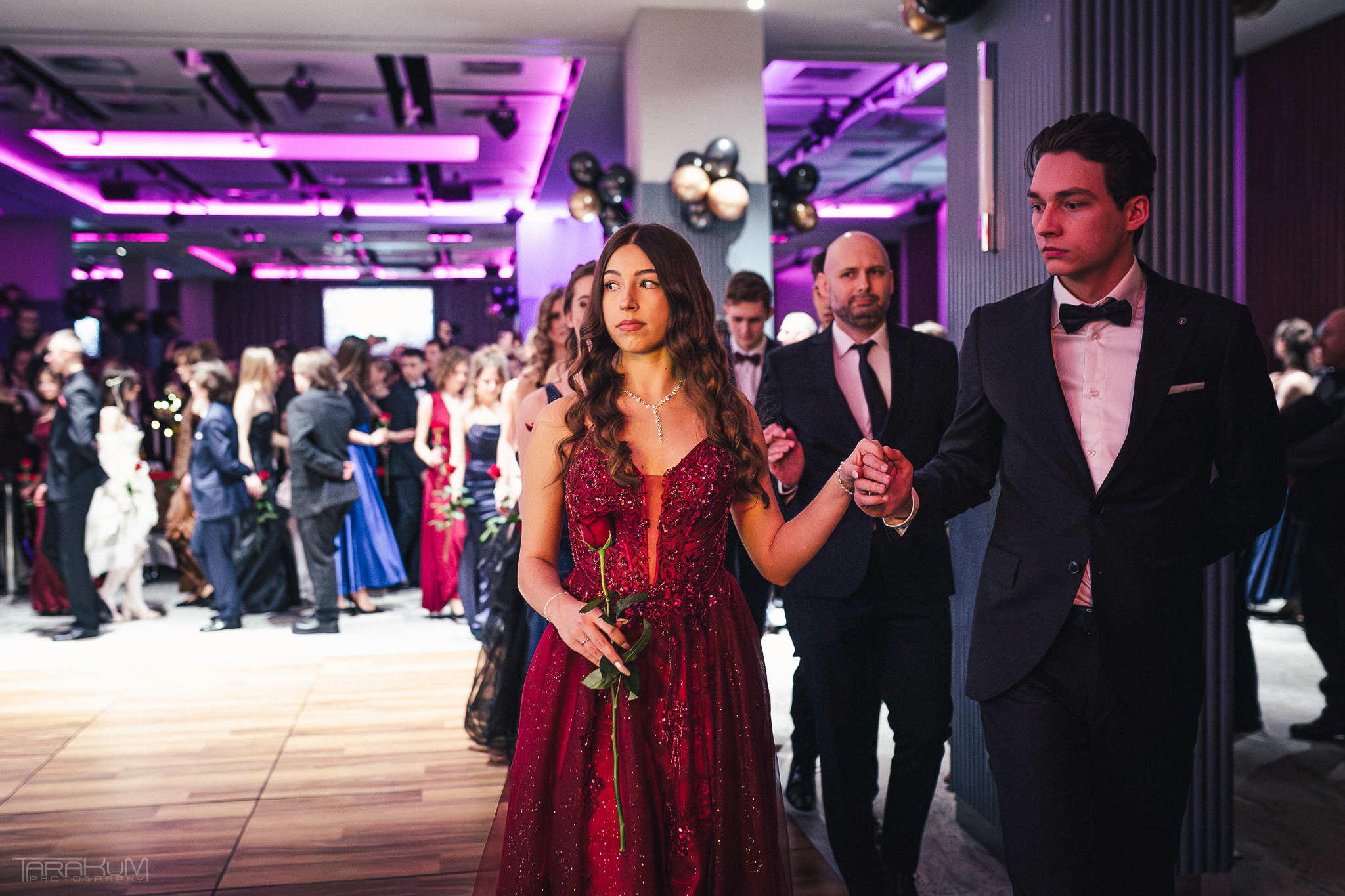 Ścianki fotograficzne to absolutna konieczność – od prostych z logo szkoły po rozbudowane konstrukcje z neonami, balonami i kwiatami. Ale prawdziwym hitem są ścianki 360°, które nagrywają krótkie filmiki w zwolnionym tempie. Efekt? Spektakularne materiały na TikToka i Instagram.