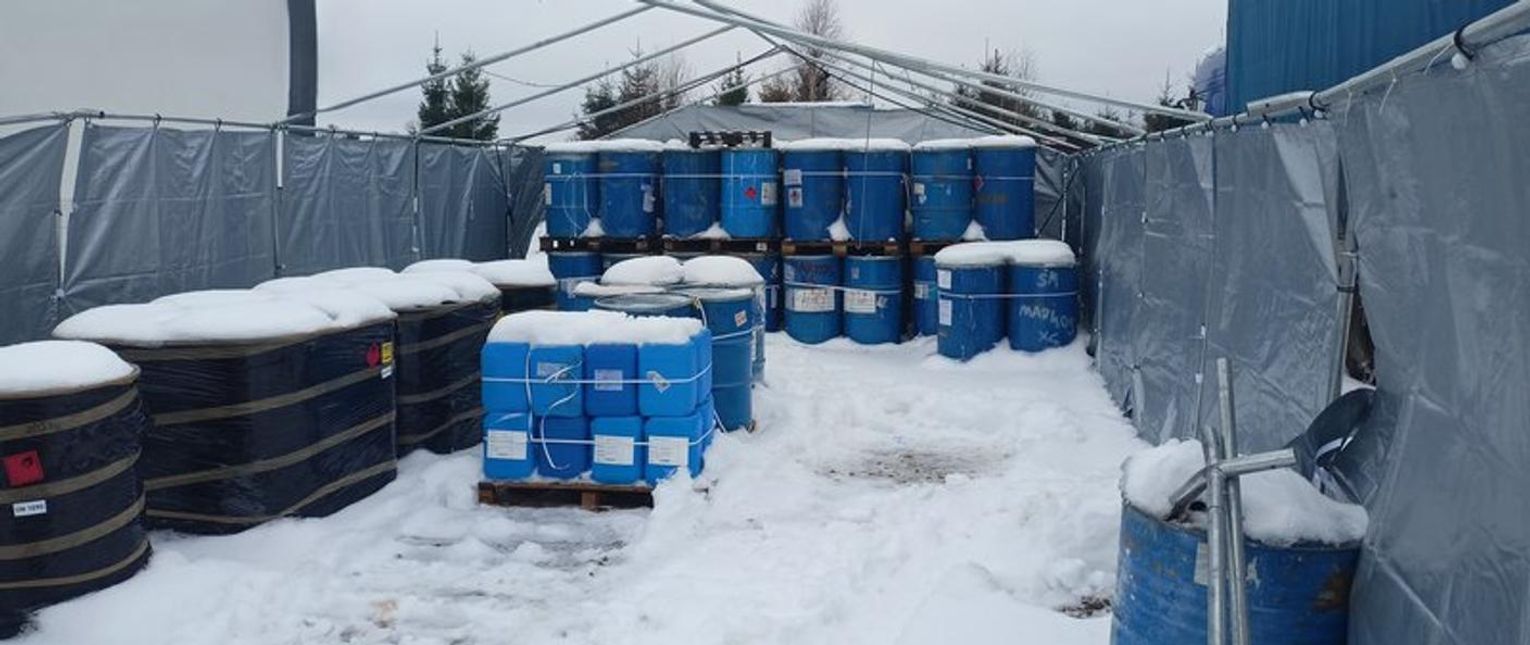 Podczas oględzin terenu, inspektorzy znaleźli około 20 ton ciekłych odpadów, zgromadzonych w beczkach, kanistrach i tysiąclitrowych paletopojemnikach, bez wymaganego przepisami zezwolenia.