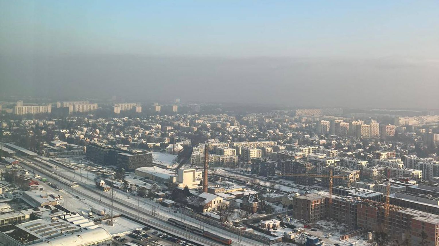 Na zdjęciu wykonanym z wyższych pięter budynku Olivia Star w Gdańsku wyraźnie widać ciemny pas zanieczyszczonego powietrza zalegający nad Trójmiastem.