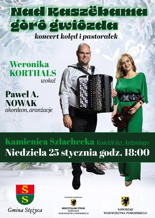 Przed nami kolejny z serii koncertów promujących płytę „Nad Kaszëbama gòrô gwiôzda”. Znakomici artyści: Weronika Korthals i Paweł A. Nowak od początku stycznia kolędują po Kaszubach, od Redy po Ugoszcz. Teraz będzie można ich posłuchać w Kamienicy Szlacheckiej. Album „Nad Kaszëbama gòrô gwiôzda” tworzy kolekcja 12 polsko- i kaszubskojęzycznych kolęd, pastorałek oraz utworów inspirowanych tradycją Bożego Narodzenia.