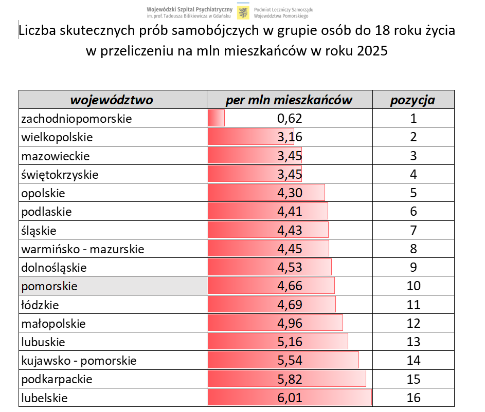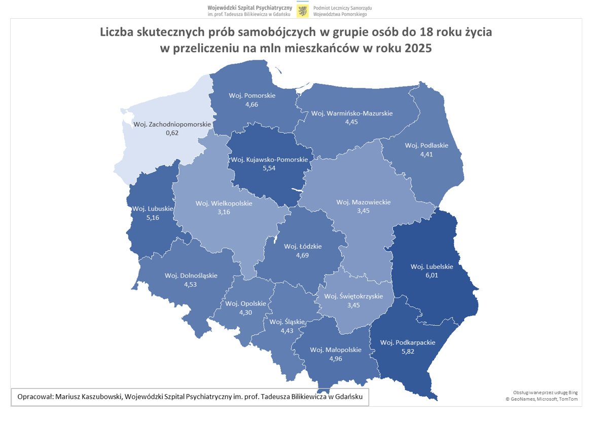 Czy rzeczywiście jednak Pomorze jest czarną plamą na mapie Polski? Nad informacjami Komendy Głównej Policji przysiadł dyrektor Wojewódzkiego Szpitala Psychiatrycznego w Gdańsku, dr Mariusz Kaszubowski, który przeprowadził analizę dotyczącą prób samobójczych wśród dzieci i młodzieży do 18. roku życia w Polsce w 2025 roku, z podziałem na województwa.