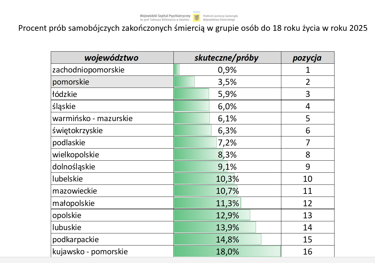 - W analizie podkreślono, że rzetelne porównywanie sytuacji pomiędzy regionami możliwe jest wyłącznie przy uwzględnieniu liczby mieszkańców - wyjaśnia Anna Czarnowska, rzeczniczka szpitala na gdańskim Srebrzysku i zarazem członkini Pomorskiego Zespołu ds. Zdrowia Psychicznego. - Z tego względu kluczowym wskaźnikiem jest liczba skutecznych prób samobójczych w przeliczeniu na jeden milion mieszkańców, a nie wartości globalne. Porównywanie samych liczb bez odniesienia do populacji - np. pomiędzy województwami tak różnymi demograficznie jak mazowieckie i opolskie - jest metodologicznie nieuzasadnione.