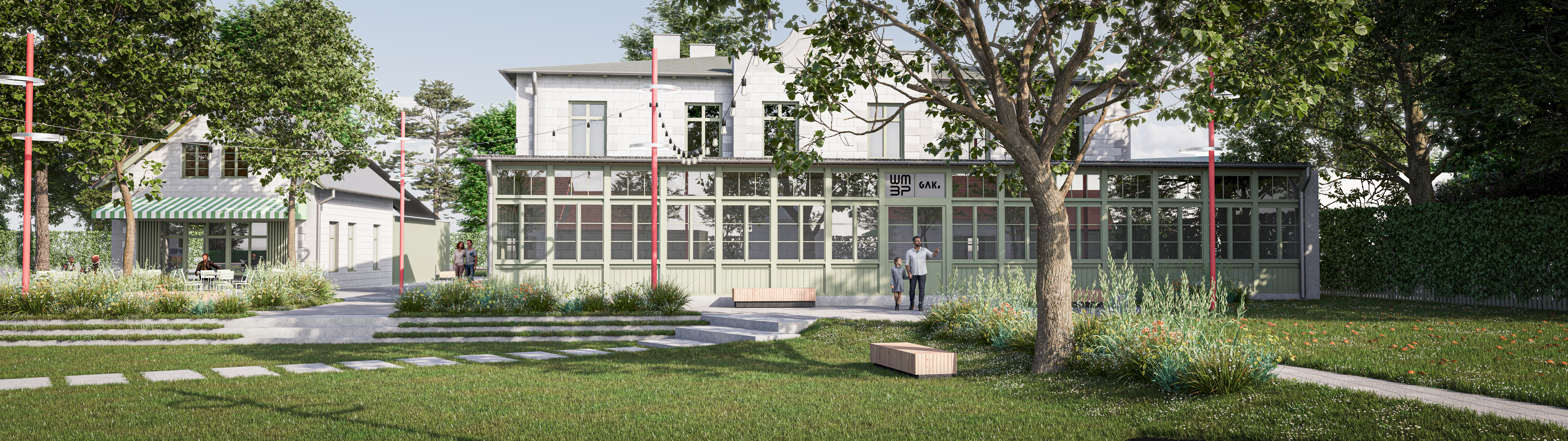 Inwestycja obejmie również zagospodarowanie przestrzeni wokół centrum. Od strony ul. Turystycznej powstanie parkowa przestrzeń publiczna z miejscami do rekreacji, zajęć plenerowych oraz ogródkiem kawiarnianym. Natomiast od strony ul. Tęczowej zaplanowano zieloną strefę zabaw oraz miejsca postojowe dla samochodów i rowerów.