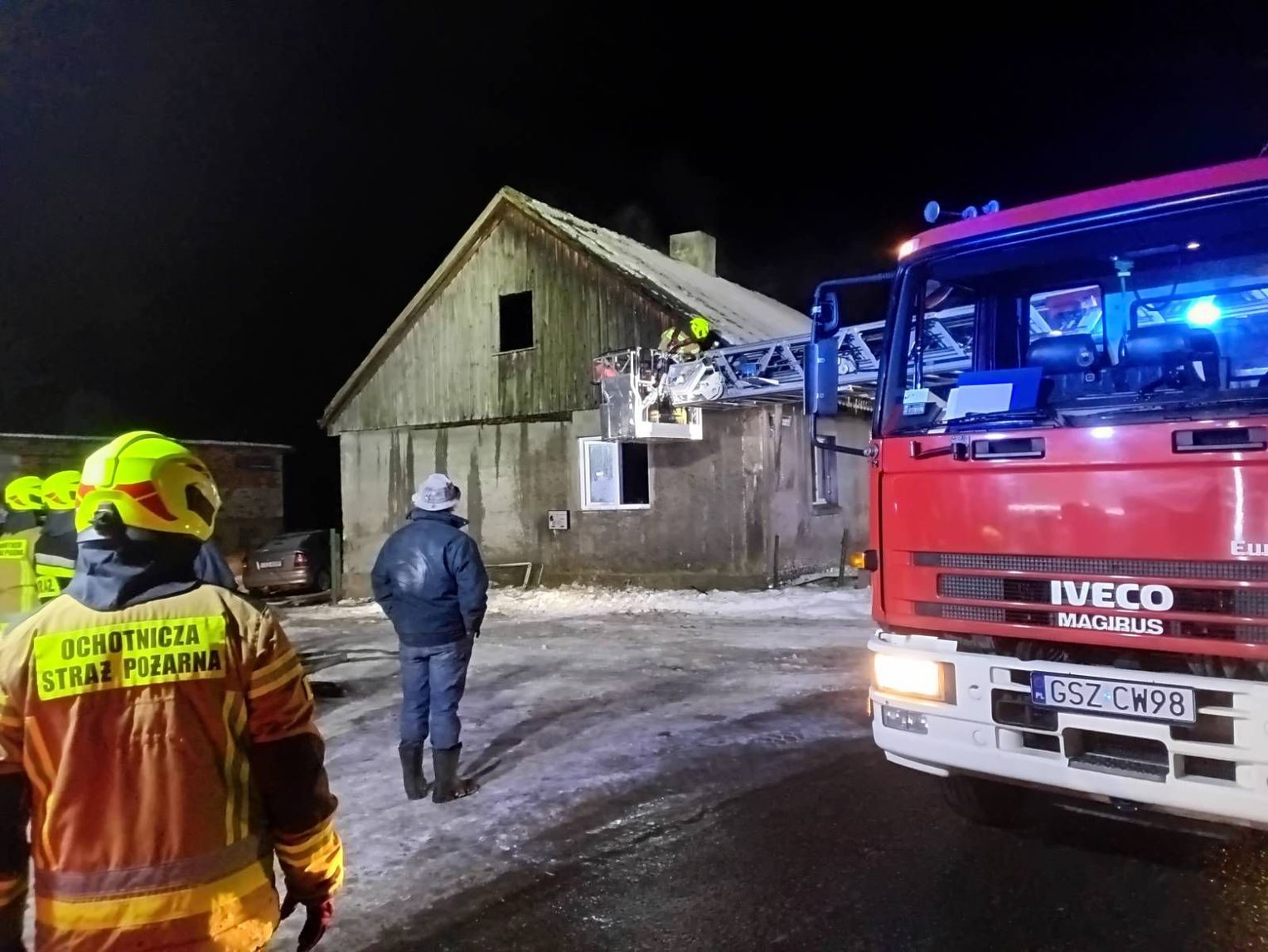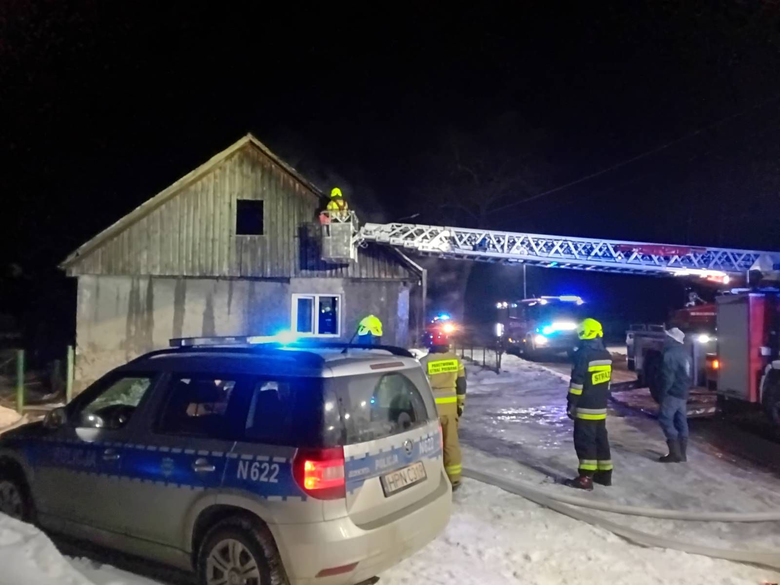 Po przybyciu służb ratunkowych okazało się, że ogień objął poddasze budynku. Na miejsce zadysponowano pięć Jednostek Ochrony Przeciwpożarowej, które prowadziły akcję gaśniczą.
