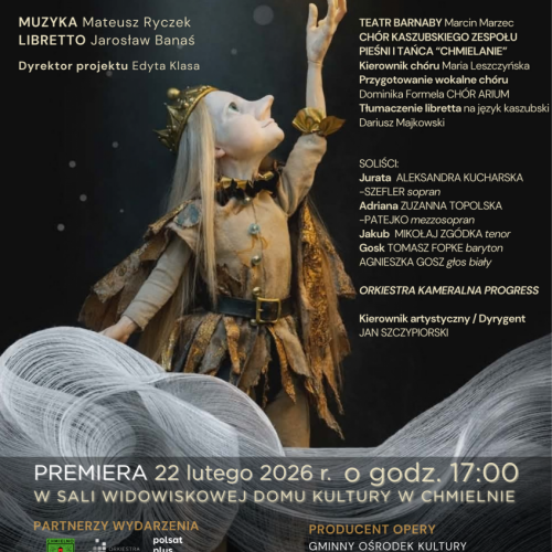W Gminnym Ośrodku Kultury, Sportu i Rekreacji w Chmielnie premiera operowa, która, jak zapewniają organizatorzy, zapisze się w historii regionu. „Bursztynowe łzy” to poruszająca opowieść inspirowana kaszubską mitologią i literaturą – o miłości, poświęceniu, gniewie morza i sile wspólnoty. Historia Juraty i rybaka Jakuba, rozgrywająca się między falami Bałtyku a sercem Kaszub, przeniesie widzów w świat magii, legend i bursztynu. To spektakl, który popularyzuje język i literaturę kaszubską, wzmacnia tożsamość kulturową, zaprasza młode pokolenie do świata tradycji, łączy profesjonalistów i lokalną społeczność na jednej scenie – czytamy w zapowiedzi. Opera z librettem w języku kaszubskim, tworzona jest przez profesjonalnych artystów oraz mieszkańców gminy Chmielno.