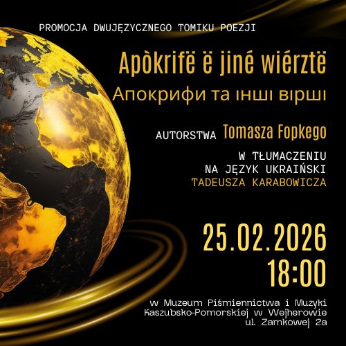 Muzeum Piśmiennictwa i Muzyki Kaszubsko-Pomorskiej w Wejherowie zaprasza na promocję dwujęzycznego tomiku poezji „Apòkrifë ë jiné wiérztë / Апокрифи та інші вірші” autorstwa Tomasza Fopkego, w tłumaczeniu na język ukraiński Tadeusza Karabowicza. Spotkanie to też część artystyczna. Wystąpi duet Kateryna Hasiuk i Marija Czarnecka, a także dzieci recytujące poezję (przygotowanie: Halina Groth). Tomik to 23 wiersze – utwory powstałe w ostatnich latach, podejmujące różnorodną tematykę: od refleksji nad aktualnymi wydarzeniami, poprzez poezję dla dzieci, nawiązania biblijne, aż po pytania natury egzystencjalnej. Tomik nie pozbawiony jest charakterystycznego dla autora humoru i ironii. Opatrzony jest dedykacją: „Tym, którzy budują mosty między narodami”.