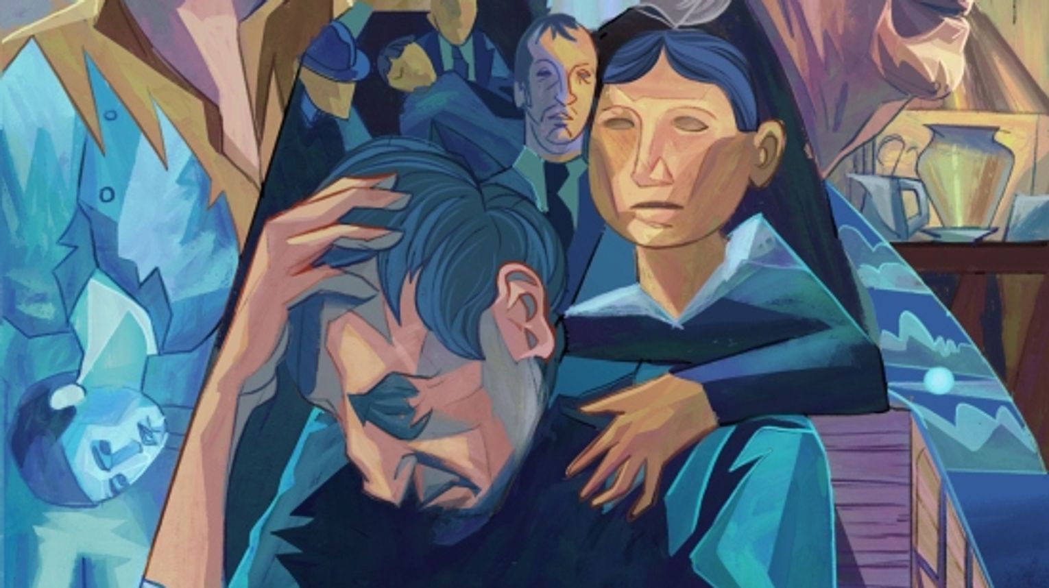 Na kompozycji, w której portrety i motywy wzajemnie się przenikają, znaleźli się: