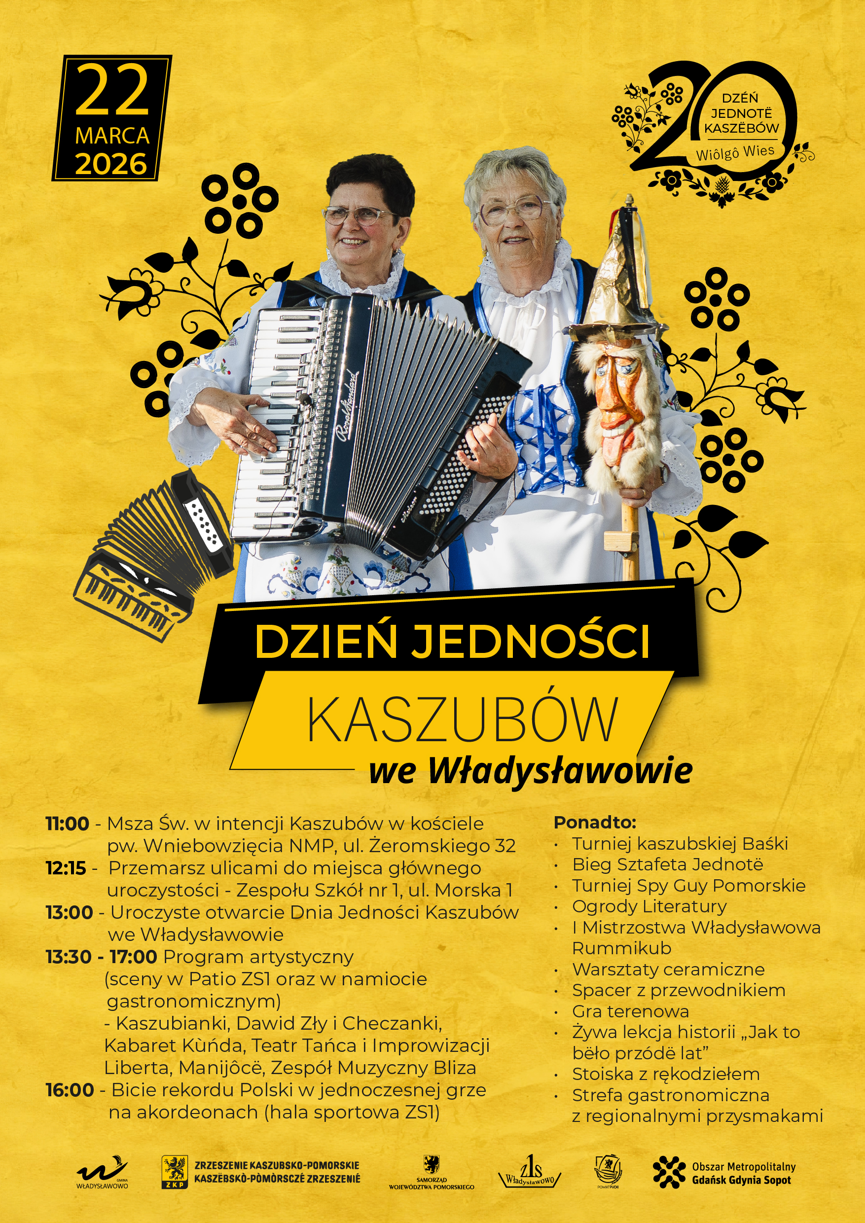Obchody Dnia Jedności Kaszubów rozpoczną się o godz. 11.00 uroczystą mszą świętą z elementami kaszubskimi w kościele Wniebowzięcia NMP (Żeromskiego 32). Po mszy uczestnicy przemaszerują do Zespołu Szkół nr 1. Na 13.00 zaplanowano tam oficjalne otwarcie, a po nim, do ok. 17.00 na scenie oraz na terenie szkoły odbywać będą się zaplanowane atrakcje.
