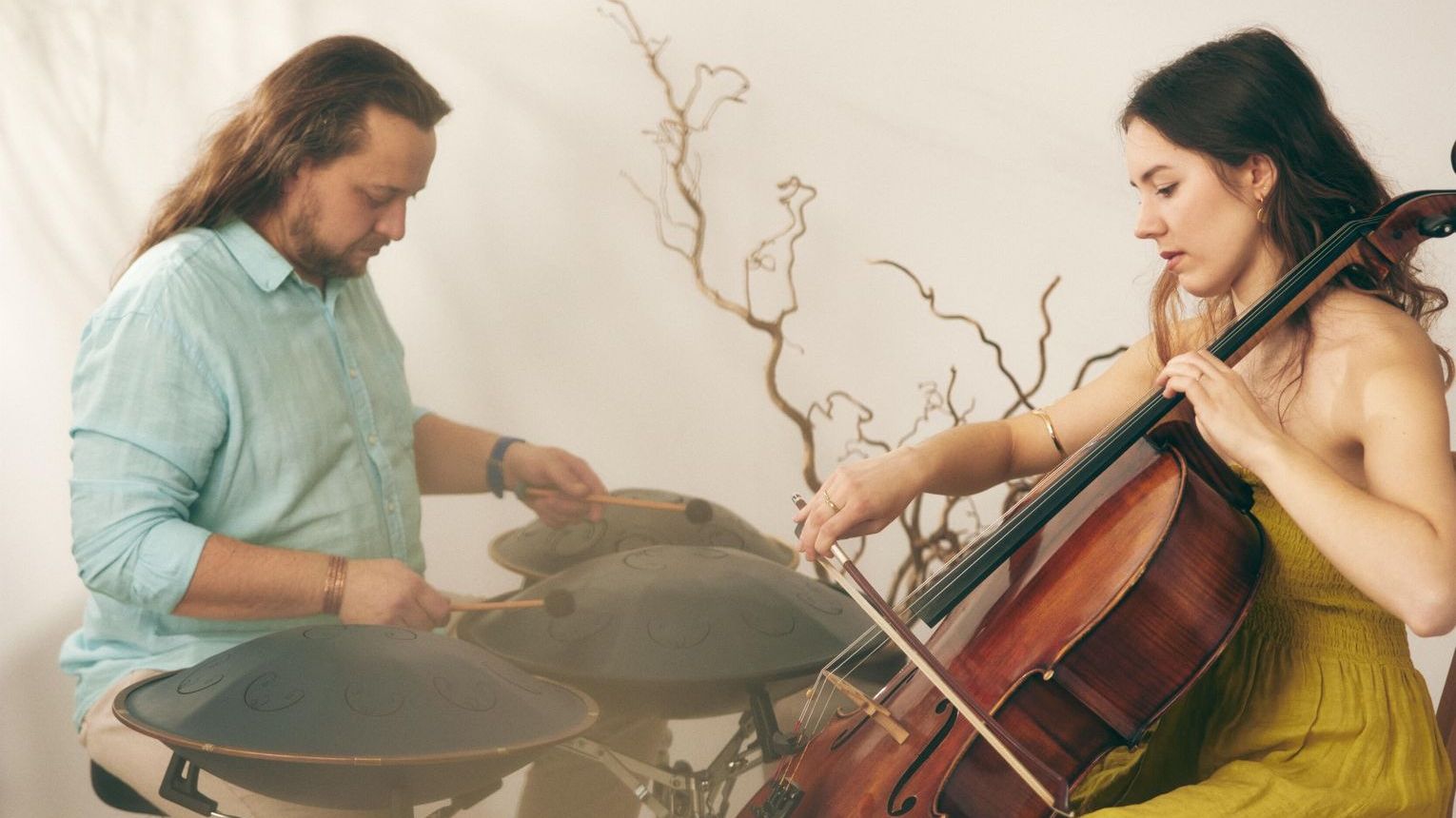 - RAV to nowy i wciąż mało znany instrument, który wyglądem przypomina nieco bardziej rozpowszechnionego handpana, pierwsze handpany powstały w 2000 roku. Jest instrumentem perkusyjnym, na którym gra się palcami lub pałkami, dającym długi, hipnotyzujący pogłos – mówi Łukasz Płecha. - RAV to częstotliwości, barwa, która niesie ukojenie. Kiedy pierwszy raz usłyszałem go na żywo, od razu chciałem na nim zagrać, to brzmienie niepodobne do niczego innego. Wciągnęło mnie kompletnie! Jak w muzykoterapii, mniej znaczy więcej, tak i tu, ograniczona liczba dźwięków budzi kreatywność. Od początku czułem, że znakomitym partnerem dla RAV będzie wiolonczela. Tak poznałem Zuzię. A gdy zaczęliśmy grać, nie potrzeba było ani słów, ani nut. Po prostu popłynęło… Kompozycje te powstawały z naturalnej potrzeby ukojenia, poszukiwania wewnętrznego spokoju, by emocje, które niesie dzień, wyciszyć muzyką. Dlatego to, co gramy to też – w pewnym sensie – koncert relaksacyjny.