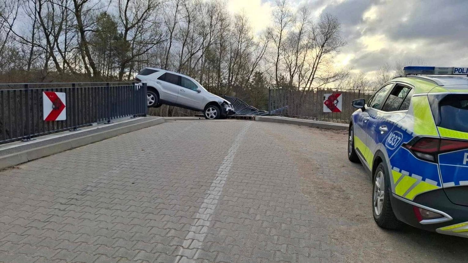 6 kwietnia rano policjanci otrzymali zgłoszenie o nietypowym zdarzeniu drogowym w Bolszewie (powiat wejherowski). W rejonie ulicy Polnej samochód osobowy marki Mercedes zawisł na moście po uderzeniu w barierki.