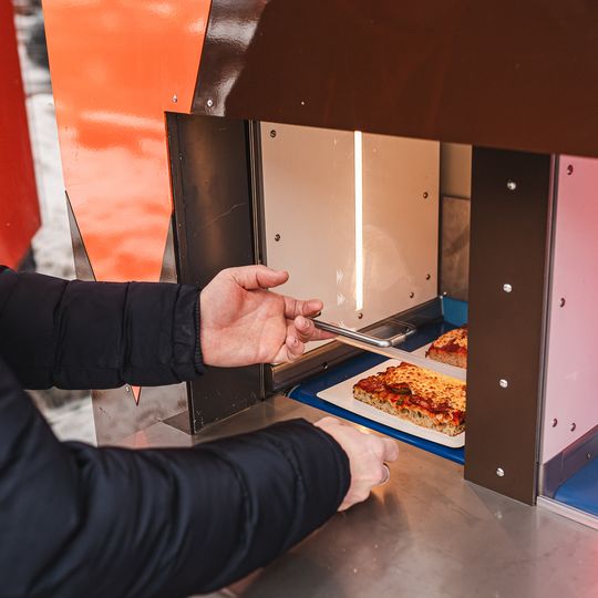Ramię robota pobiera pizzę, wkłada ją do pieca, a po wypieczeniu wydaje gotowy produkt klientowi. Kupujący mogą obserwować to na własne oczy przez szybę automatu. Cały proces odbywa się bez udziału obsługi i jest w pełni powtarzalny – każda pizza przygotowywana jest w taki sam sposób.