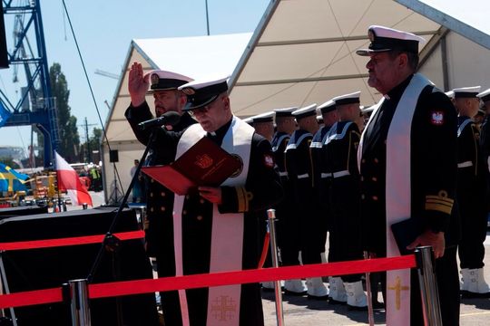 Wodowanie i chrzest okrętu rozpoznawczego Jerzy Różycki w Gdańsku