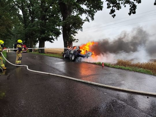 Groźny wypadek w Janiszewie pod Pelplinem. Samochód stanął w ogniu